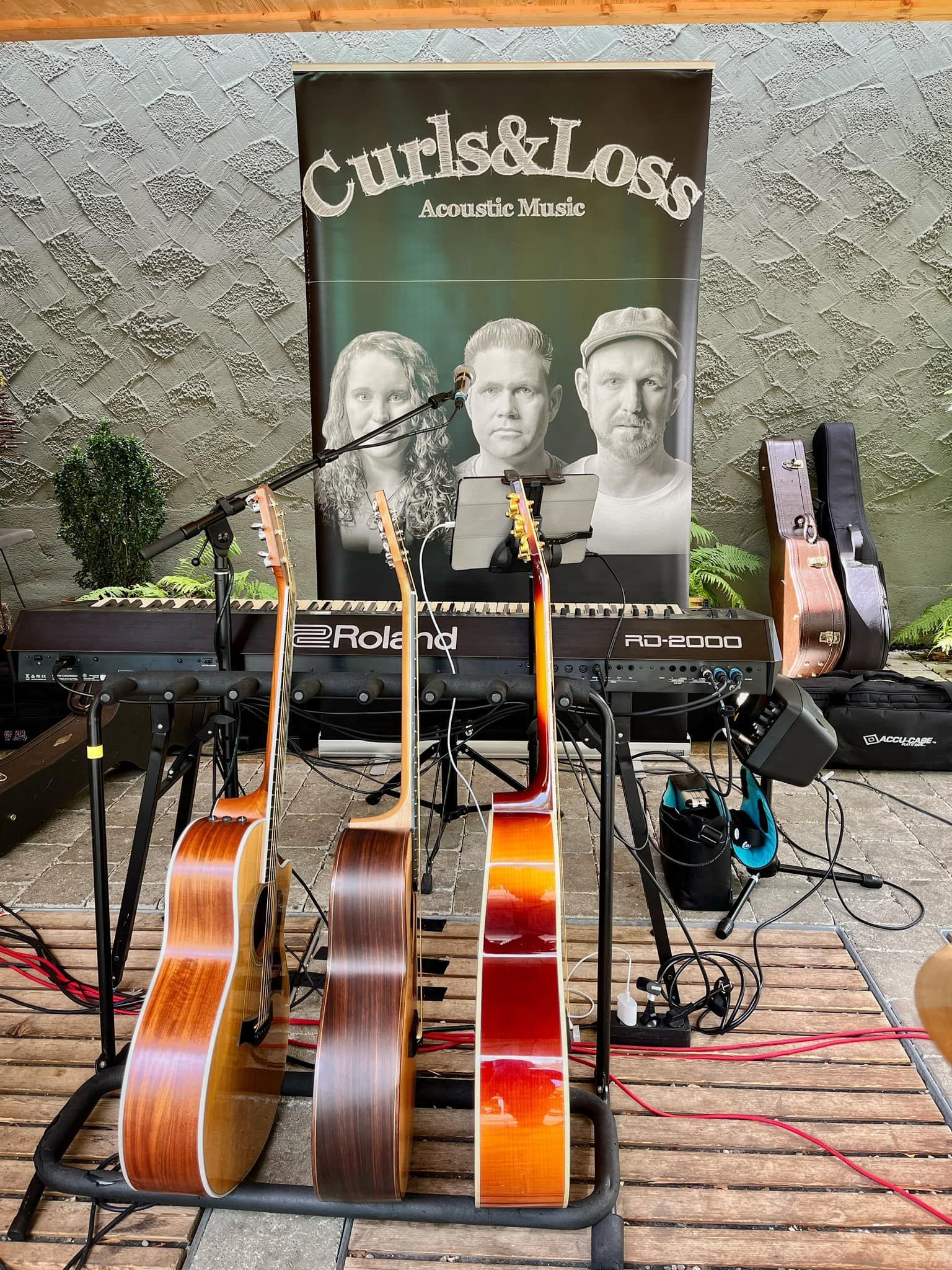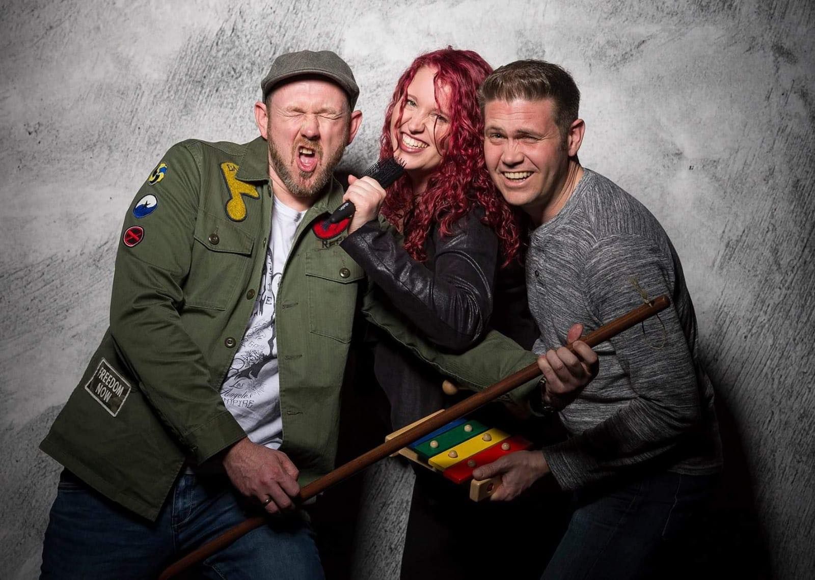 Ein Trio mit vielen Instrumenten wie Akustikgitarre,
